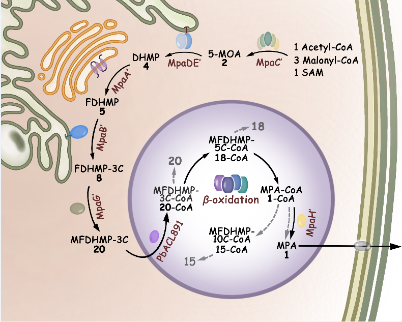 Besides identification of the oxygenase MpaB' as the long-sought key enzyme responsible for the oxidative cleavage offarnesyl side chain andthe enzymatic mechanisms,the intriguing pattern of compartmentalization for the MPA biosynthetic enzymes is revealed, including the cytosolic polyketide synthase MpaC’ and O-methyltransferase MpaG', the Golgi apparatus-associated prenyltransferase MpaA', the endoplasmic reticulum-bound oxygenase MpaB' and P450-hydrolase fusion enzyme MpaDE', and the peroxisomal acyl-CoA hydrolase MpaH'.The whole pathway is elegantly co-mediated by these compartmentalized enzymes,and the subcellular localization of the acyl-CoA hydrolase MpaH' in peroxisomes is required for the unique cooperation between biosynthetic andβ-oxidation catabolism machineries.
